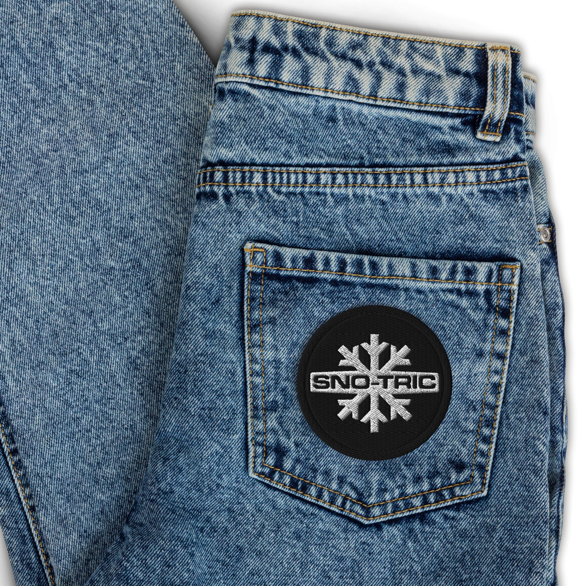 Embroidered fabric label with the Sno-Tric logo, Durable and heat-resistant twill fabric.